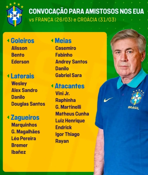 Convocação da Seleção Brasileira anunciada por Carlo Ancelotti para amistosos contra França e Croácia